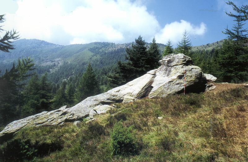 Immagini totali: 44 |Fig. 3. Veduta complessiva di Roccho Vélho da Est, con la cresta spartiacque Germanasca / Risagliardo sullo sfondo (graduazione della stadia: 20 cm). |